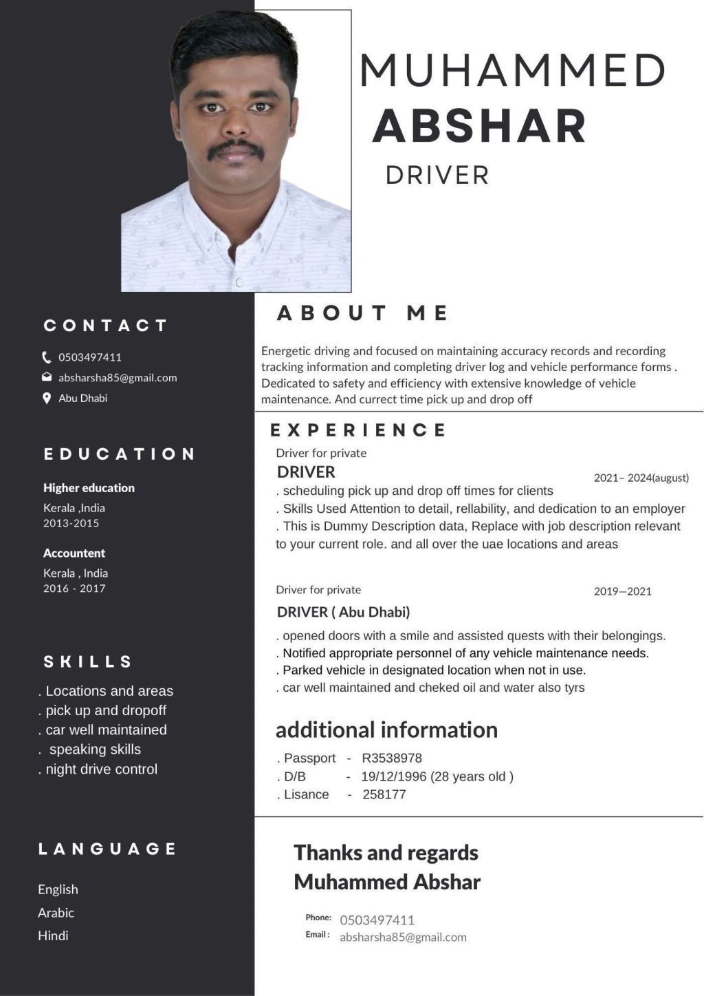 Am Muhammed abshar from India (Kerala) now am looking for a driver job I have manual license and 7 years of experience in Abu Dhabi and Dubai (private driver) contact me