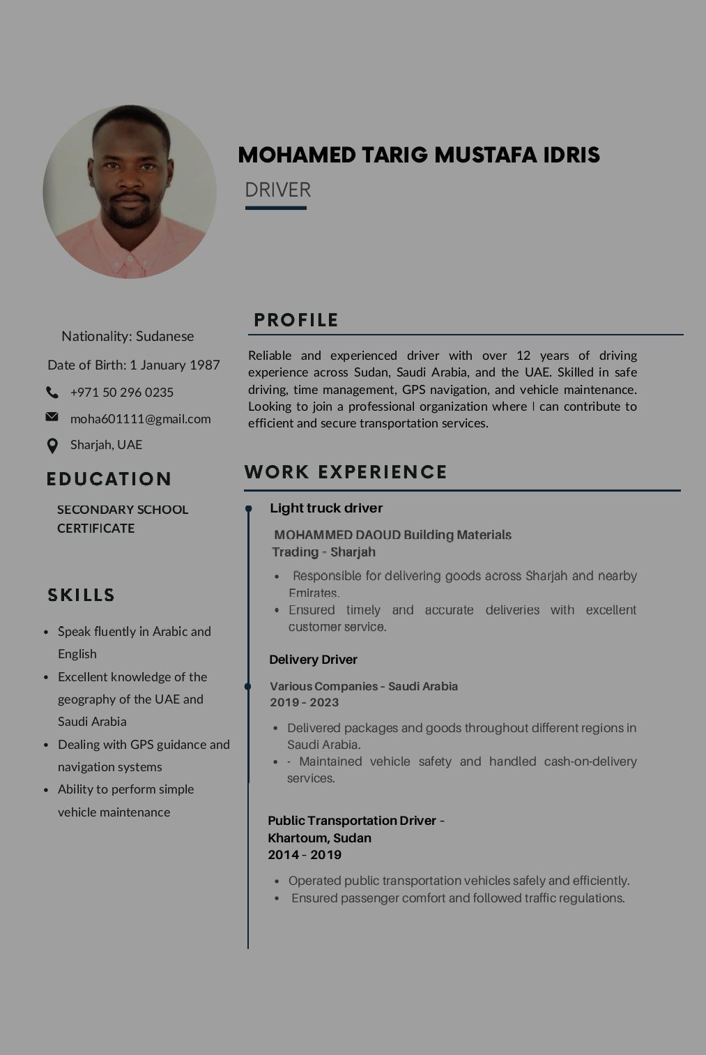 A reliable and experienced driver with over 12 years of driving experience throughout Sudan, Saudi Arabia, and the UAE. Skilled in safe driving, time management, GPS navigation, and vehicle maintenance. I am looking forward to joining a professional organization where I can contribute to efficient and safe transportation services. Excellent knowledge of the UAE's geography and handling of GPS navi