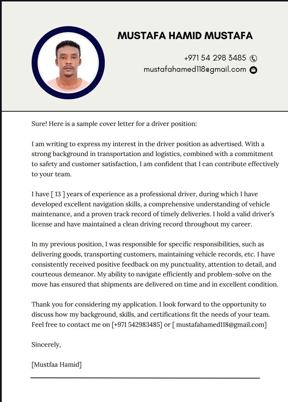 Ako ay isang driver na may 13 taong karanasan sa UAE at 8 taong karanasan sa pagmamaneho. Naghahanap ako ng trabaho na may magandang sahod at handa na akong magtrabaho next month, God willing