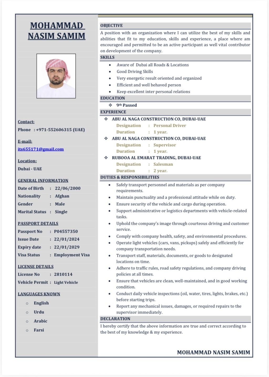 Experienced and responsible salesman of 2 years of experience in sales in marketing providing excellent customer service. Holds a valid UAE Light Vehicle License No. 3