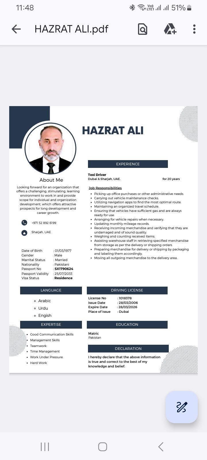 My Nam Hazrat Ali I am from pakistan I am looking for driver job I have light vehicle manual and automatic license no 3 my 15 year driving experience in Dubai taxi and 10 year experience as a home driver. I am a speaking English Arabic Urdu handi and Pashto my qualifcation matric