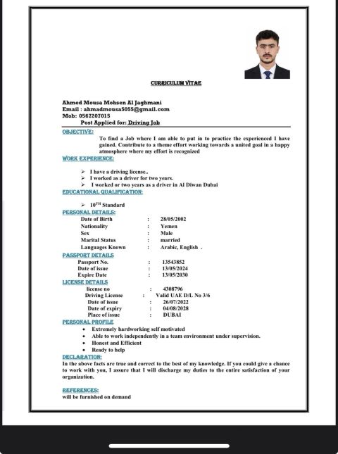 Assalam. My name yoonus Abdullah I I am 25 years old am looking for parsonal driver job. I have 4 years driving experience in UAE my contact