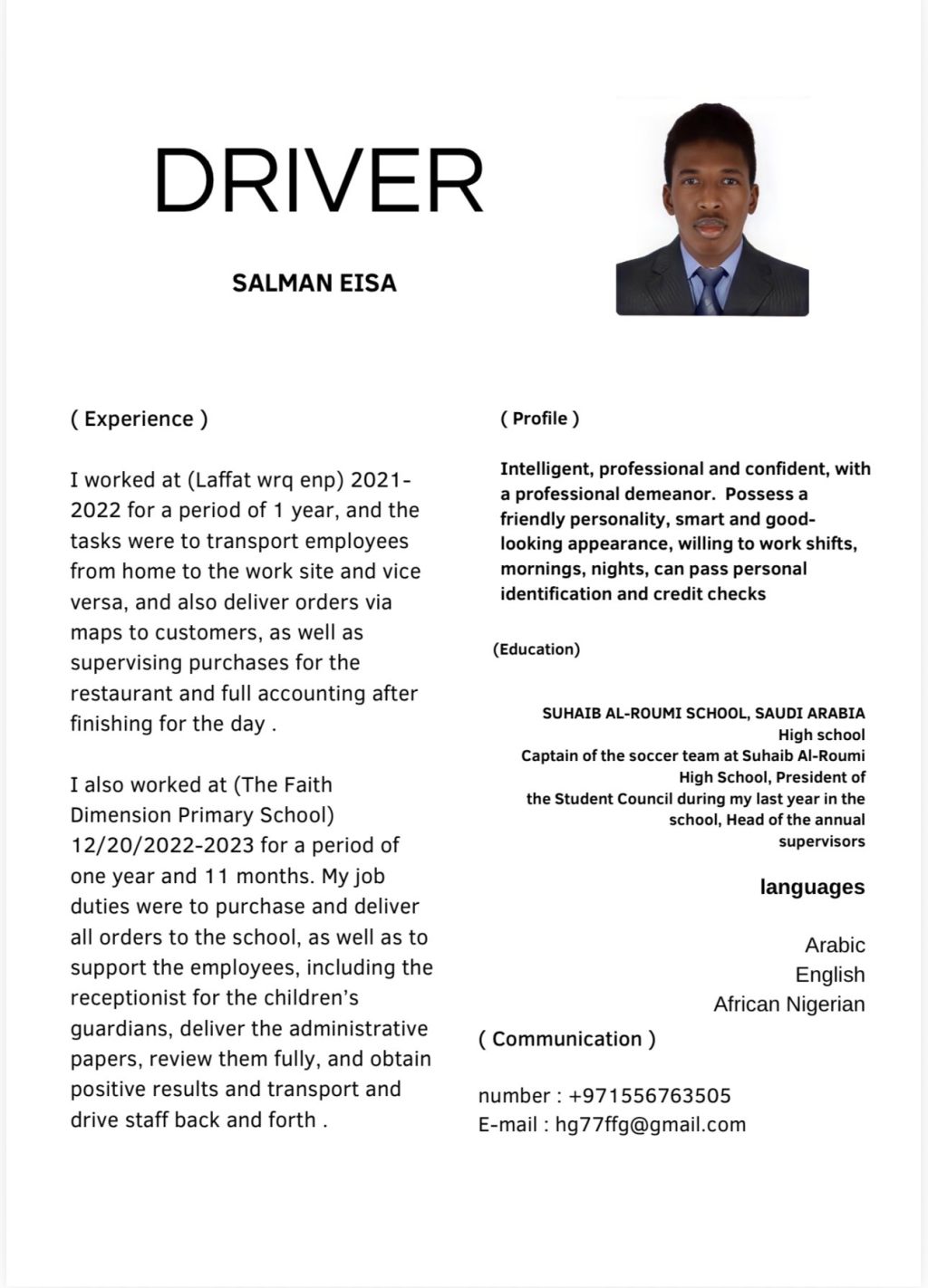 I am looking for a driver's job and I have experience in driving luxury cars and I previously worked (car showroom + VIP driver + private domestic driver + for shops, requests and purchase of goods + school driver and other tasks) I master the Gulf and Middle English