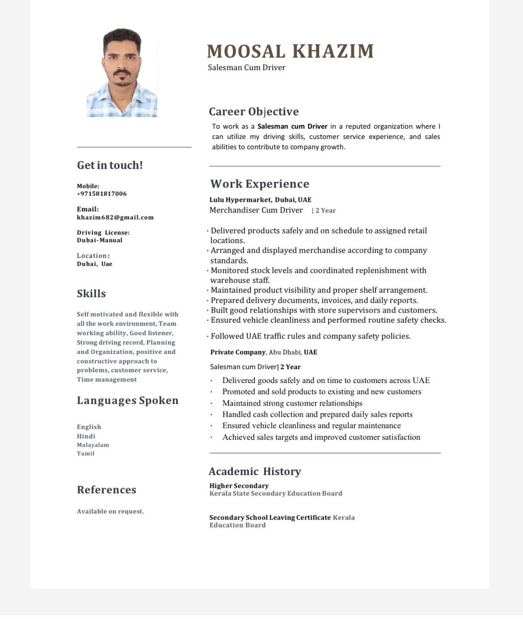 My name is Moosal Khazim from Kerala, India. I have Dubai manual driving license Dubai manual 4 years experience