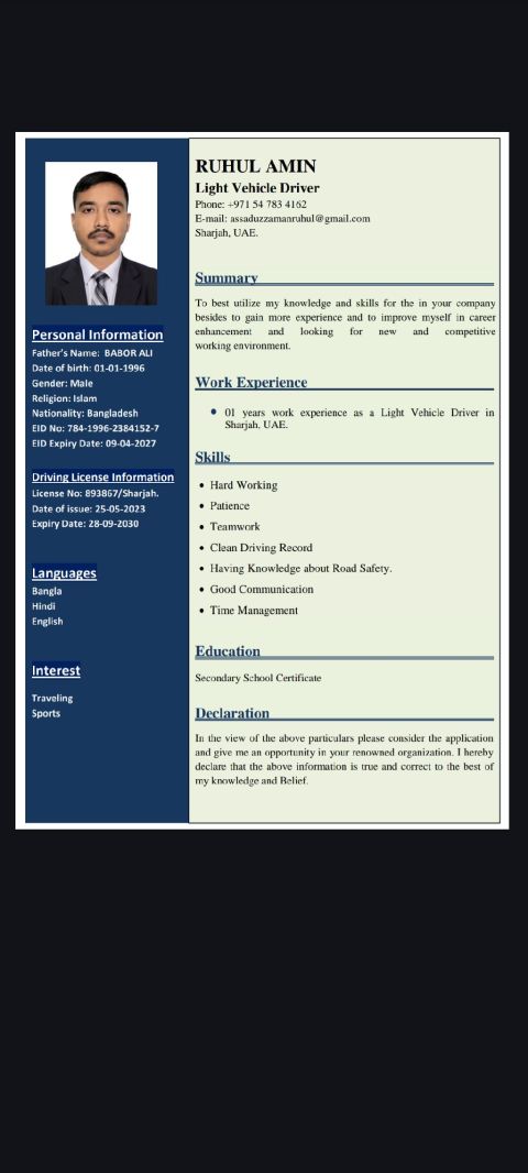 I have 5 years of experience in driving I can drive all luxury and delivery vehicles also have heavy trucks license and international experience in all Over GCC I can speak English and arabica