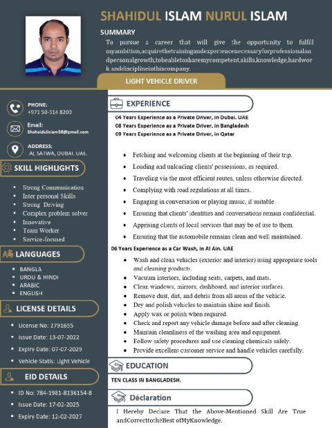 My name is shahaidul Islam from Bangladesh I have UAE Light Vehicle License I have 25 Years. Experience. N Qatar and UAE I have a car I have good K I have car nowledge of UAE & Qatar