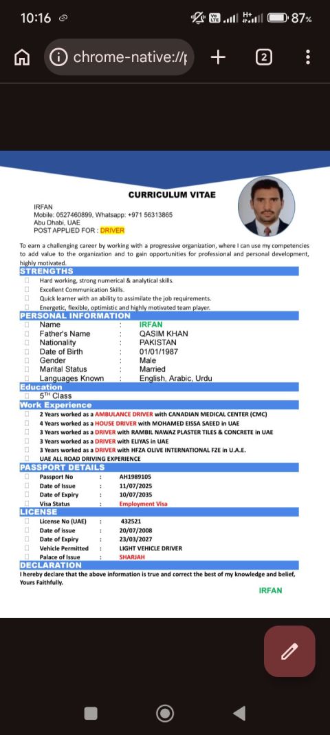 My name is Irfan. I am driver I need a job. leaving in Abu Dhabi Mussafah M17. driving experience 18 years in UAE. languages Urdu, English, Arbi. age 39 years. call