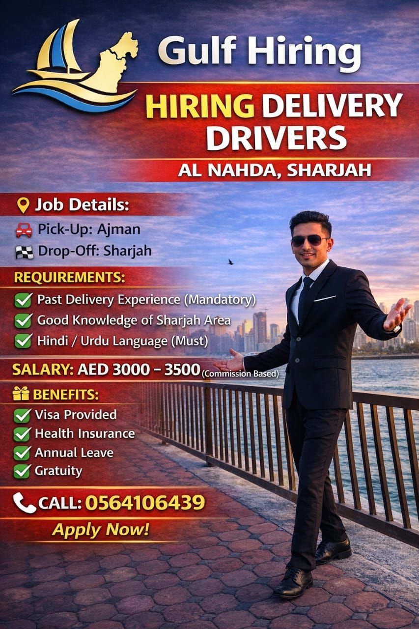 Need Delivery Drivers for Al Nahda, Sharjah. Past Delivery Experience is Mandatory. Good Knowledge of Sharjah Area is Required. Hindi/ Urdu Language is Must. PickUp in Ajman. DropOff in Sharjah. Salary 3000 - 3500 (commission based) Visa, Health Insurance, Leave, Gratuity