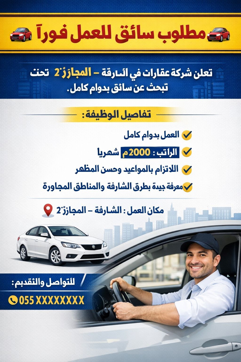 مطلوب سائق للعمل فورا تعلن شركة عقارات مقرها الشارقة - المجاز 2 عن حاجتها الى سائق للعمل بدوام كامل. تفاصيل الوظيفة العمل بدوام كامل الراتب 2000 درهم شهريا الالتزام بالمواعيد وحسن المظهر معرفة جيدة بطرق الشارقة والمناطق المجاورة مكان العمل الشارقة - المجاز 2