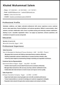الاسم خالد سالم مقيم بدولة الامارات خبراتي العملية مسؤول تخليص جمركي بمطار القاهرة الدولي وبعد ذلك مسؤول خدمة عملاء بمصلحة الجمارك المصرية ويعد ذلك مدير للمبيعات بشركة الكيان لمسحتضرات التجميل وبعدها مسؤول خدمة عملاء بالبنك الزراعي المصري وحاليا متواجد بدولة الامارات اعمل مسؤول مبيعات بشركة للتمويلات البنكية