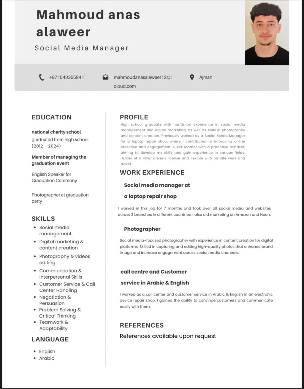 شاب سوري ابحث عن عمل لدي خبرة في التسويق والسوشيال ميديا والتواصل مع العملاء عملت مسؤول سوشيال ميديا وعملت ك مصور ولدي رخصة قيادة حسن المظهر ولباقة في الكلام وأتكلم الانجليزية والعربية