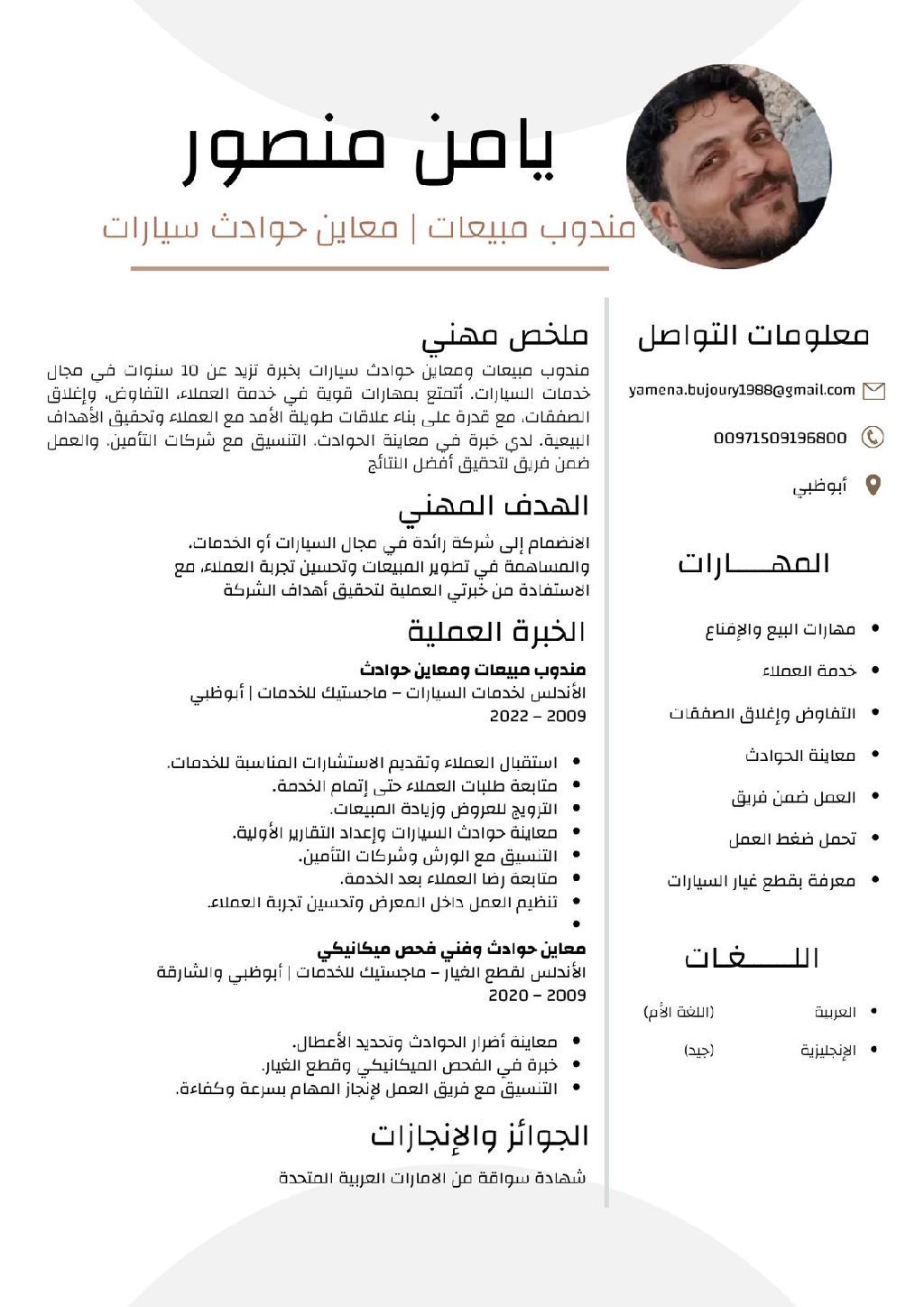 معاين حوادث ومندوب بيع وشراء وخبرة في الكراجات ومواقع العمل وفورمان عمال الميكانيك والسمكرة ولدي شهادة سواقة خبرة في الامارات منذ 2009
