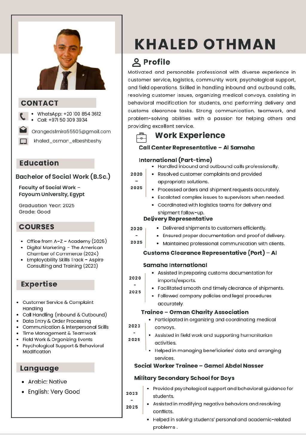 A 23 - year - old Egyptian with a Bachelor's degree in Social Work. Experience includes working as a representative for an international shipping company and as a customs broker at the port. I am also a skilled driver. I have completed training with the Orman Association, organizing medical convoys, and providing training as a specialist in a secondary school. I have five years of experience in shippi