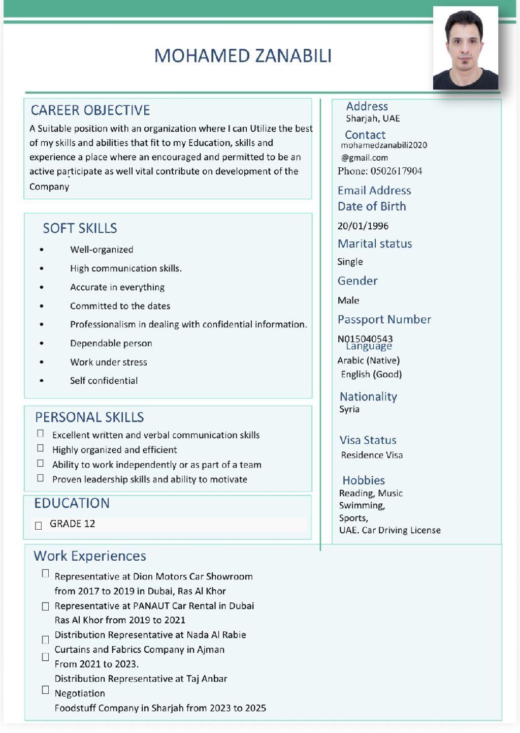 ابحث عن عمل مندوب أو توزيع عمل مندوب في ديون موتورز معرض سيارات من 2017 لي 2019 في دبي رأس الخور عمل مندوب في PANAUT تأجير السيارات في دبي رأس الخور من 2019 لي 2021 عمل مندوب توزيع في شركة ندى الربيع الستائر والأقمشة في عجمان من 2021 لي 2023 مندوب توزيع في شركة تاج عنبر المواد الغذائية في الشارقة من 2023 لي 2025