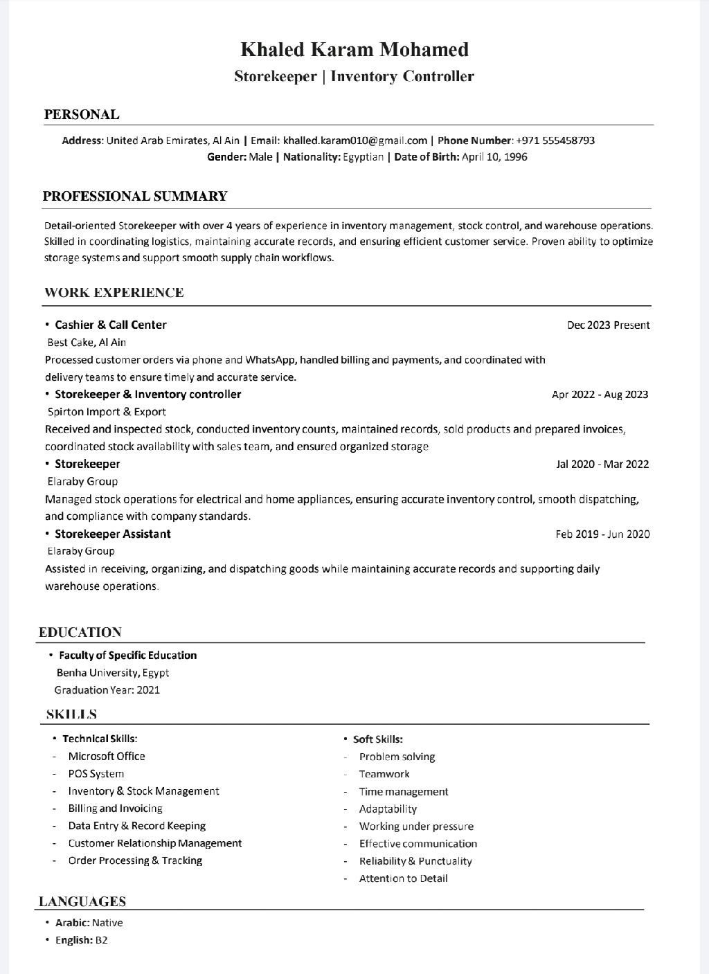 Storekeeper seeking a job opportunity. I have 4 years of experience in warehouse management, including receiving and dispatching goods, organizing and arranging the warehouse, inventory control, monitoring shortages, and handling invoices and issue vouchers. available to start immediately