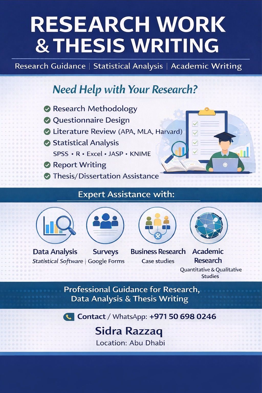 I provide professional guidance for Research Work, Data Analysis, and Thesis Writing for students in Statistics, Business, and Social Sciences. If you need help with Research Projects, Assignments, or Dissertations, feel free to reach out. Abu Dhabi Online support available worldwide