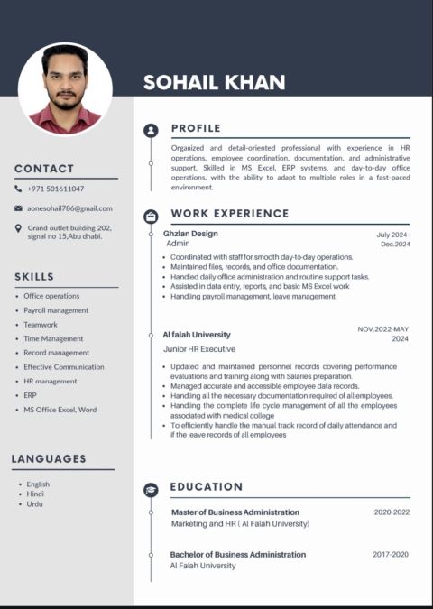 Job seeker looking for an opportunity in the UAE. I have skills in Microsoft Office (Word, Excel, PowerPoint) and intermediate English. I am willing to learn and develop. If you need an employee, please contact me