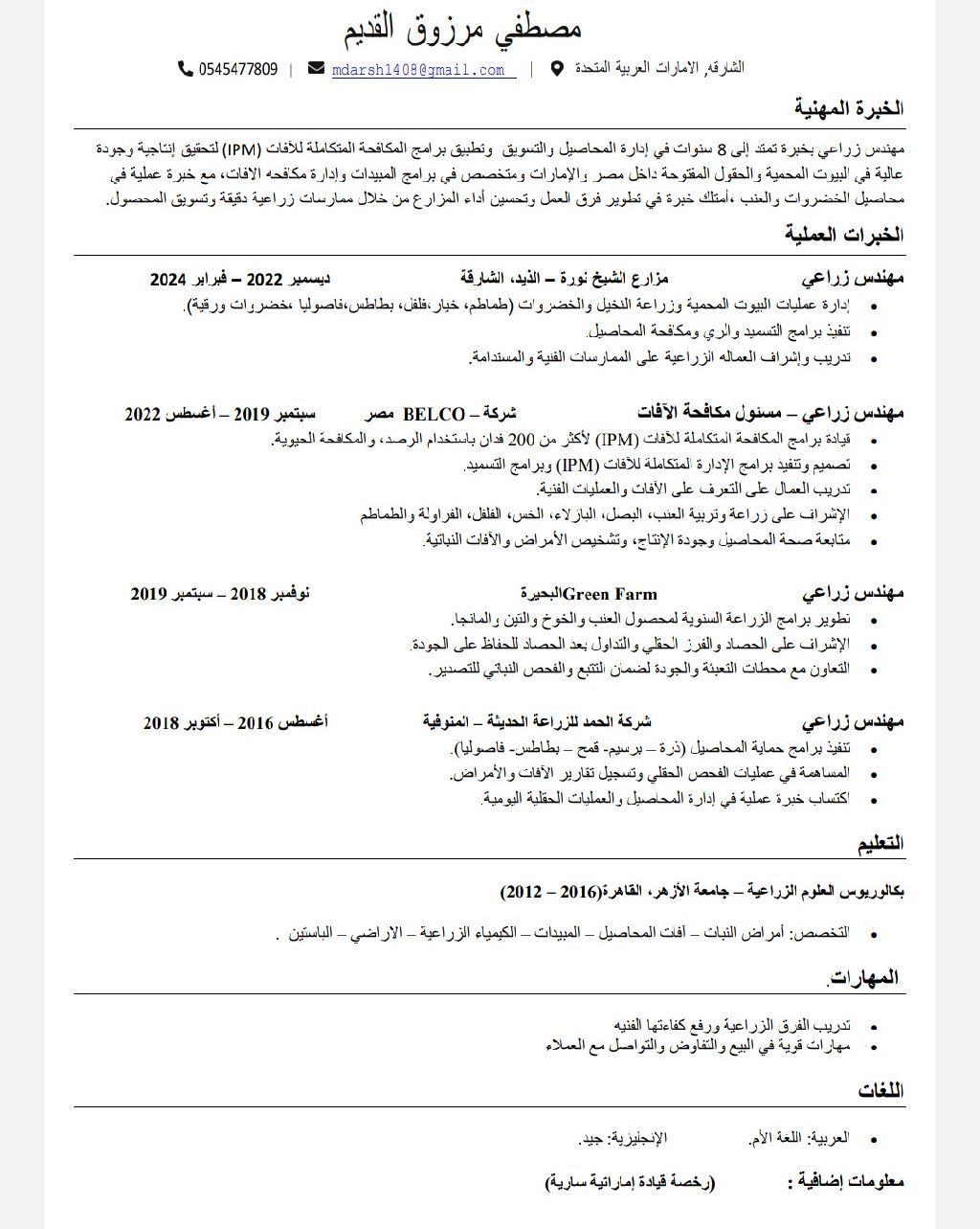 مهندس زراعي خبرة 8 سنوات في إدارة وتشغيل المزارع بأنظمتها المختلفة (البيوت المحمية والحقول المكشوفة) في مصر والامارات. خبرة في إدارة محاصيل الخضر (طماطم وخيار - فلفل وكوسة وورقيات) بالاضافة الى النخيل. أجيد وضع وتنفيذ برامج الري والتسميد والمكافحة المتكاملة للآفات (IPM) وتحسين جودة وإنتاجية المحاصيل. اشراف كامل على العمالة الزراعية وتدريبهم على الممارسات الفنية امتلك رخصة قيادة اماراتية سارية