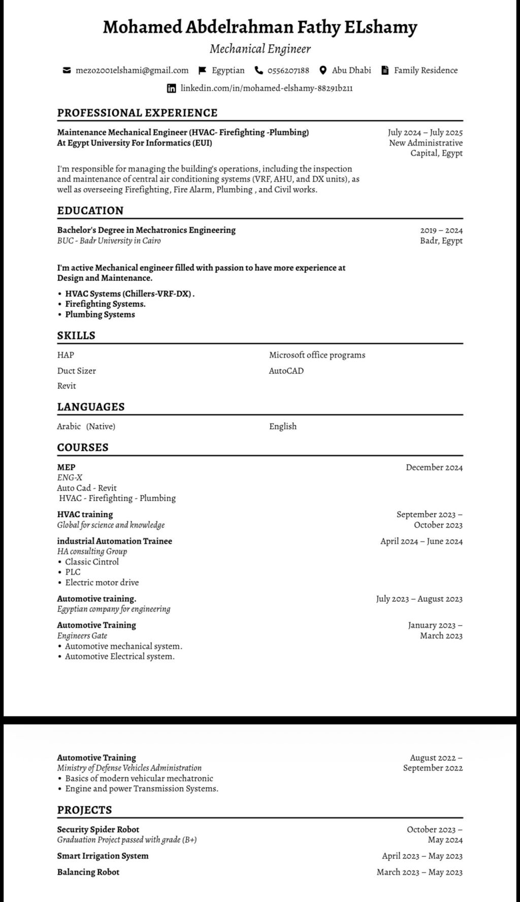Egyptian mechanical engineer in Abu Dhabi have 2 years visa and driving license graduated 2024 from Egypt have 1 year experience in Egypt worked in mechanical works (HVAC - firefighting)