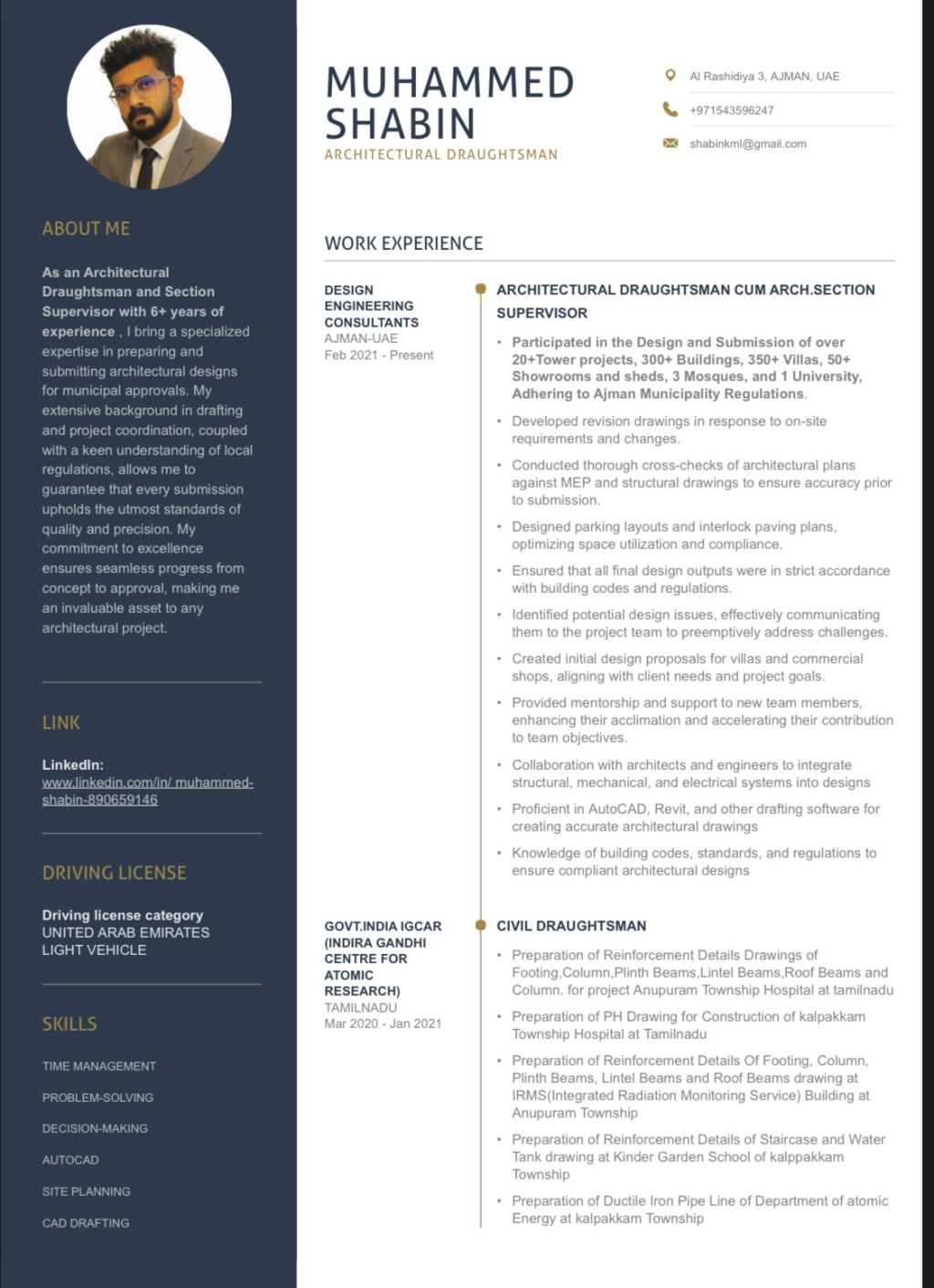 أكتب لأعبر عن اهتمامي بمنصب رسام الهندسة المعمارية. لدي خبرة قوية في العمل في مشاريع البنية التحتية والسكنية والتجارية والصناعية، الى جانب الخبرة في دولة الامارات العربية المتحدة، والتي أعتقد انها تجعلني مرشحا قويا لهذا الدور. سأكون ممتنا لإتاحة الفرصة لمناقشة كيف يمكن لمهاراتي أن تساهم في فريقك. محمد شابين رسام العمارة