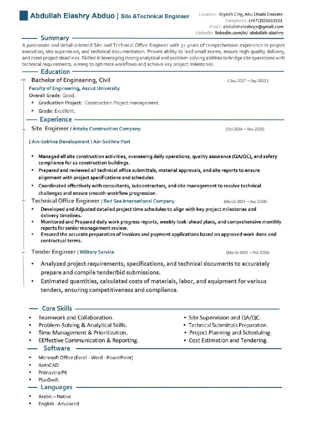 مهندس مدني خبرة لأكثر من 3 سنوات في أعمال الحصر والمستخلصات وأيضا أعمال التنفيذ والسلامة المهنية وضمان وضبط الجودة QA & QC ومتواجد في مدينة الرياض امارة أبوظبي ولدي رخصة قيادة مصرية