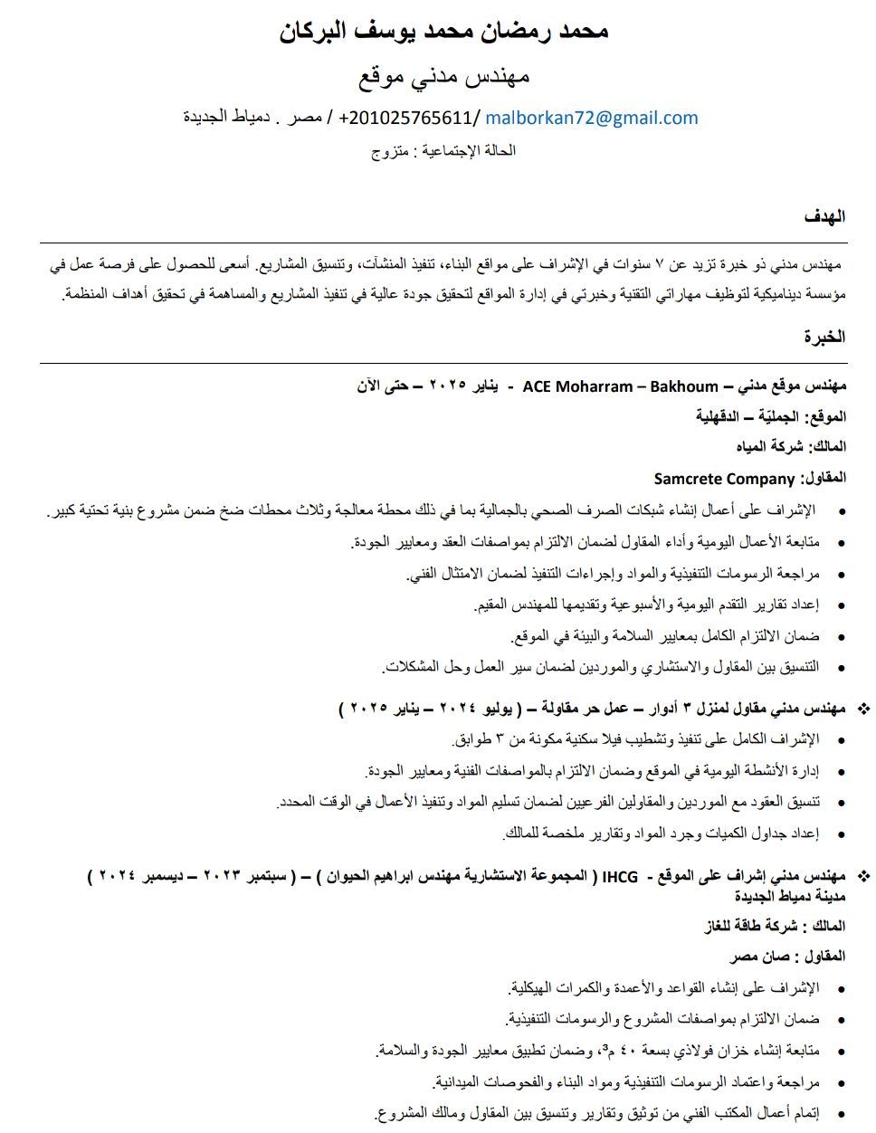 مهندس مدني موقع خبرة أكثر من 7 سنوات في الاشراف والتنفيذ، أملك خبرات عمل مختلفة كمهندس موقع بالمشروعات الانشائية، البنية التحتية، ومشروعات الموانئ (مباني وأبراج سكنية - فلل - محطات - شبكات - أرصفة ومرافق) اجادة التعامل مع الرسومات، متابعة الأعمال، ضبط الجودة والسلامة، والتنسيق مع المقاولين والاستشاريين، وإدارة المشروعات. متواجد حاليا داخل مصر ومستعد للعمل في أي مكان