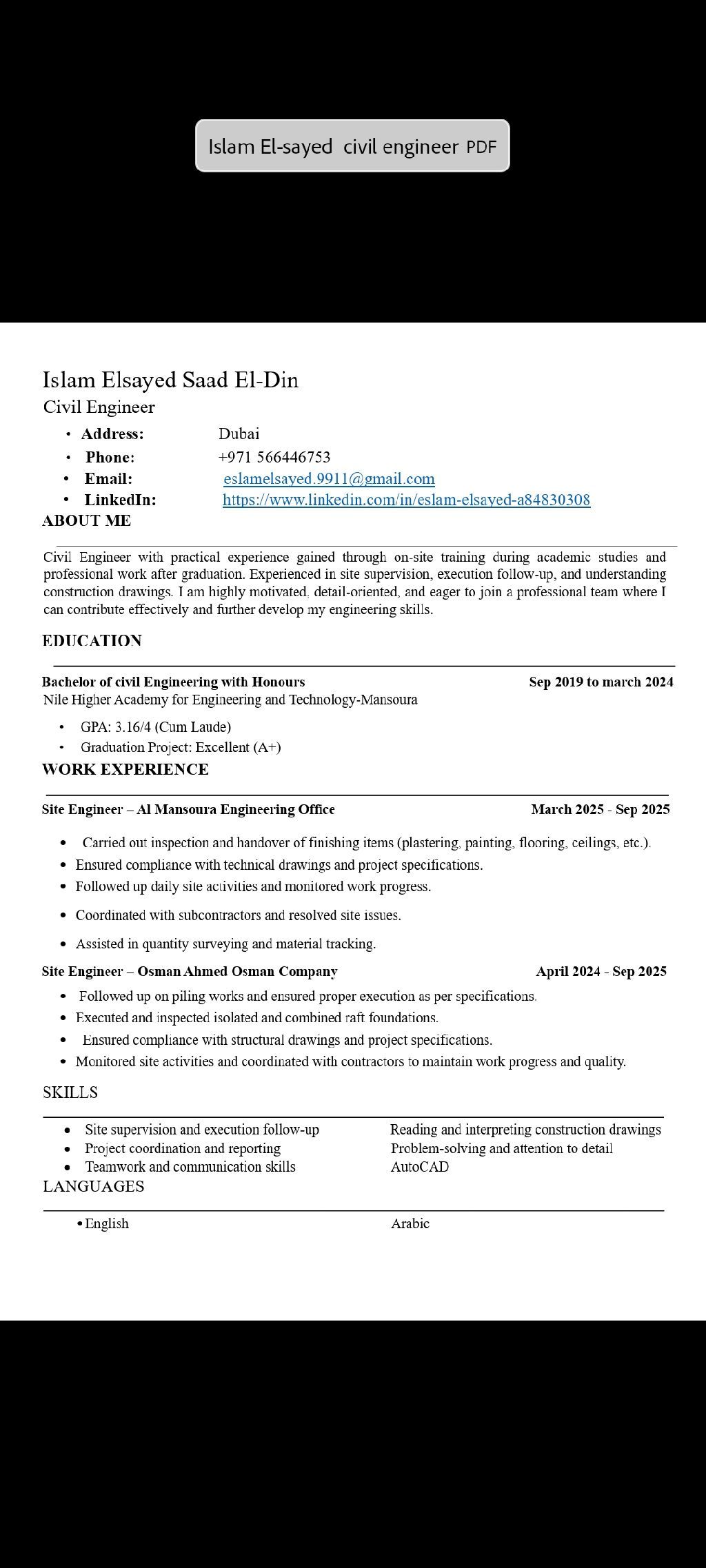 مهندس مدني خريج 2024 امتلك خبرة سنة في مصر بالتشطيبات والتنفيذ متواجد بدولة الامارات فيزا زيارة ابحث عن أيه فرصة عمل في المجال