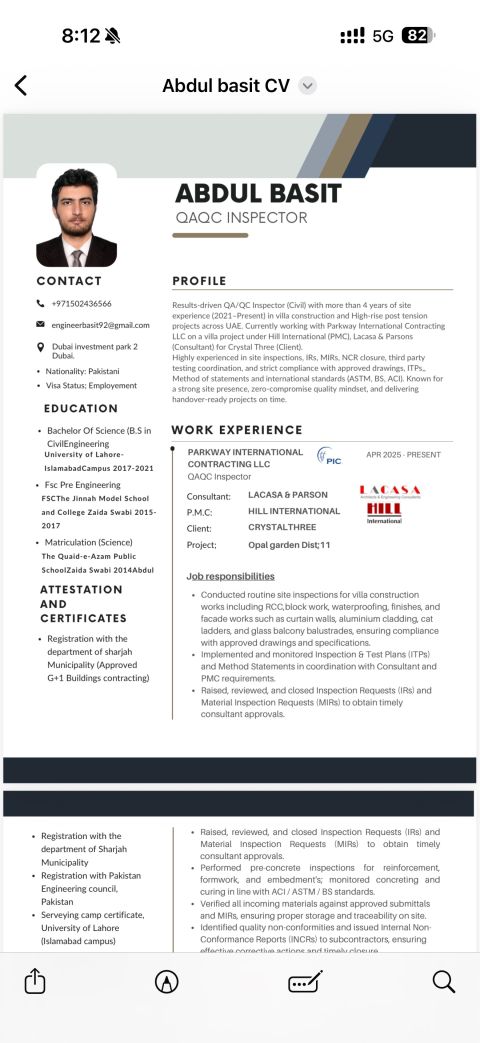 I am currently seeking a position as a Civil QA/ QC Inspector. I have 4 years of experience in the UAE, along with a valid UAE driving license. I am also DM - approved (Sharjah) If there are any suitable vacancies, please feel free to contact me