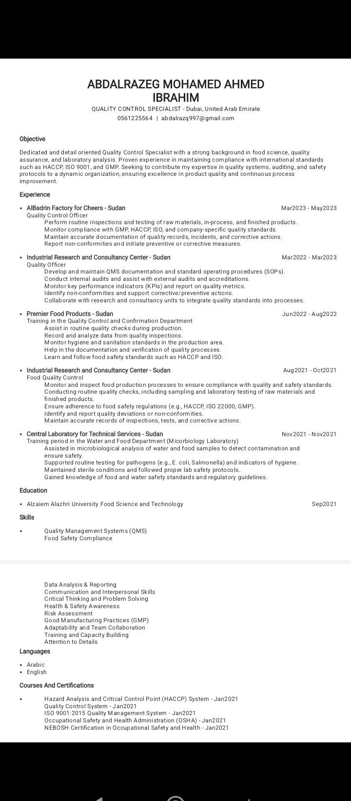 مهندس كيميائي سوداني، طموح مقيم في الشارقة خبرة عملية في مجال ضبط الجودة والاشراف على تنفيذ المهام والتجارب بدقة ومتابعة الأعمال وفق المواصفات والمعايير المطلوبة في جدولها الزمني لتلبية الاحتياجات المطلوبة، ابحث عن فرص عمل