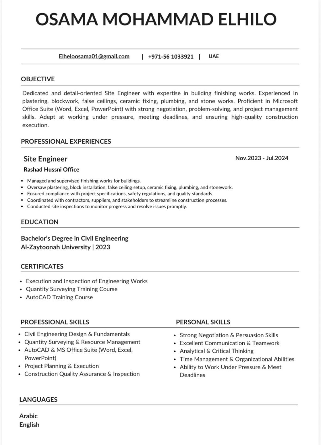 مهندس مدني عن فرصة عمل كمهندس موقع داخل الامارات. لدي معرفة جيدة في أعمال التشطيبات وقراءة المخططات، أتميز بسرعة التعلم والقدرة على العمل ضمن فريق وتحت الضغط، ومتاح للعمل فورا. للتواصل