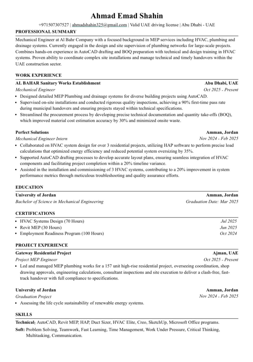 مهندس ميكانيك خبرة سنة فالتكييف والسباكة ابحث عن فرصة في الظفرة بدع زايد حبشان أو أبوظبي، أملك رخصة قيادة اماراتية وأجيد التصميم والرسم AutoCAD, Revit، أجيد حساب الكميات والاشراف فالموقع والتنسيق مع العمال والمهندسين، قادر على التعلم بسرعة في أي مجال