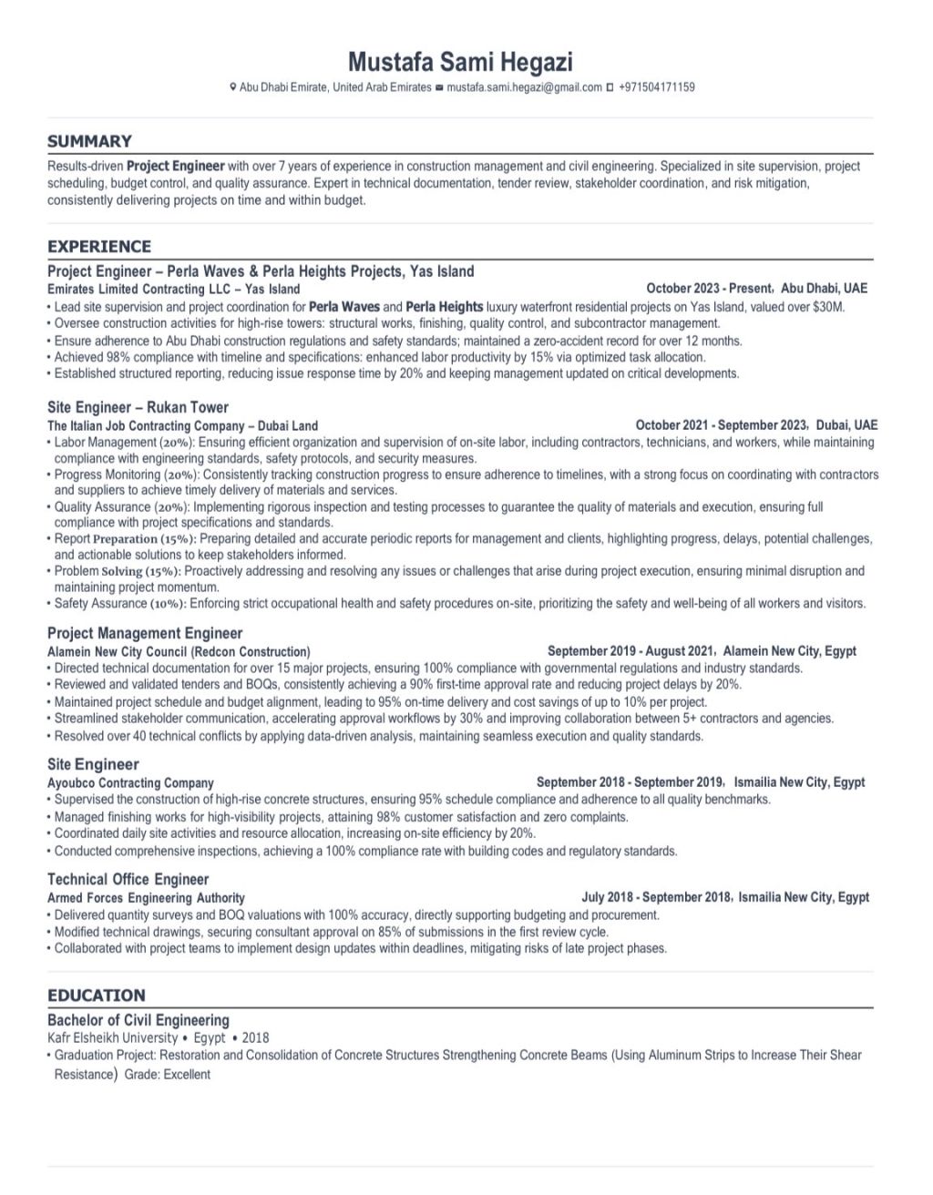 مهندس مشاريع قائم على النتائج مع أكثر من 7 سنوات من الخبرة في إدارة البناء والهندسة المدنية. متخصص في الاشراف على الموقع، المشروع الجدولة ومراقبة الميزانية وضمان الجودة. خبير في الوثائق الفنية، ومراجعة المناقصات، وتنسيق أصحاب المصلحة، وتخفيف المخاطر، تسليم المشاريع باستمرار في الوقت المحدد وفي حدود الميزانية