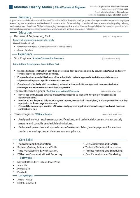 مهندس مدني خبرة لأكثر من 3 سنوات في أعمال الحصر والمستخلصات وأيضا أعمال التنفيذ والسلامة المهنية وضمان وضبط الجودة QA & QC ومتواجد في مدينة الرياض امارة أبوظبي ولدي رخصة قيادة مصرية