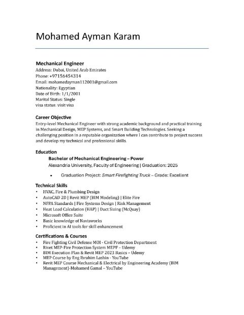 I am a mechanical engineer with a Bachelor of Engineering degree from Fares University of Alexandria, seeking employment in the automotive maintenance field as a workshop engineer, service engineer, or workshop supervisor. I have two years of experience in this field and an excellent understanding of automotive repair procedures. I am skilled at working in fast - paced environments and meeting custo