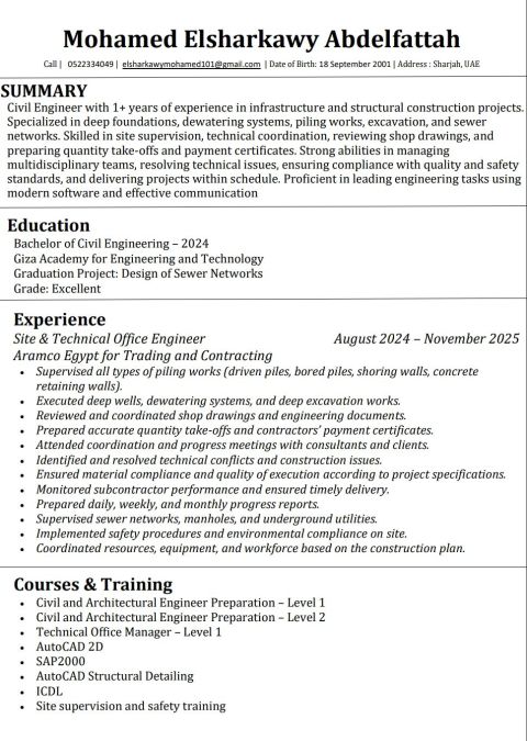 مهندس مدني متواجد في الشارقة عمات من قبل في مصر في مجال الأساسات العميقة ومتطلع للعمل في المجالات الأخرى وابحث عن فرص عمل مناسبة