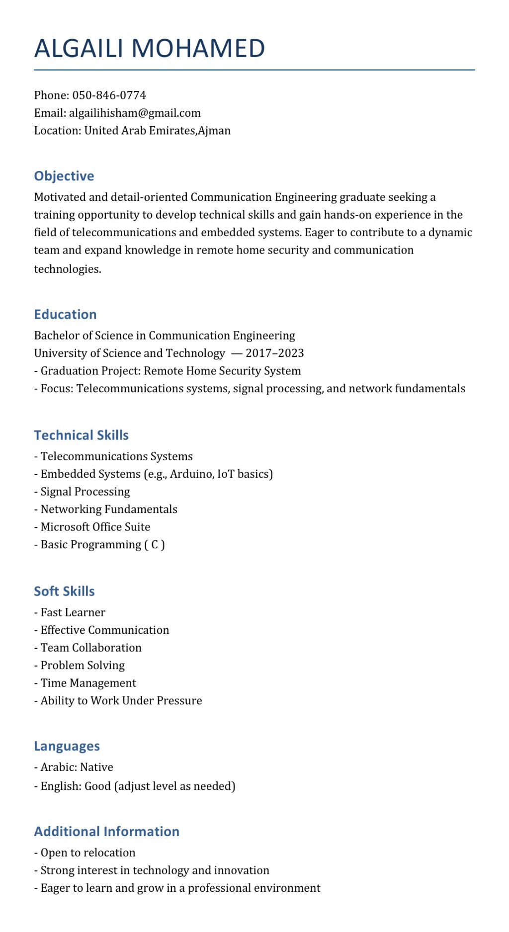 I am a fresh graduate in Telecommunication Engineering, seeking an opportunity to apply my knowledge and grow professionally. Skills include basic knowledge of networking (CCNA) familiarity with Packet Tracer and MATLAB, hardworking, reliable, quick learner, and a team player with a strong work ethic