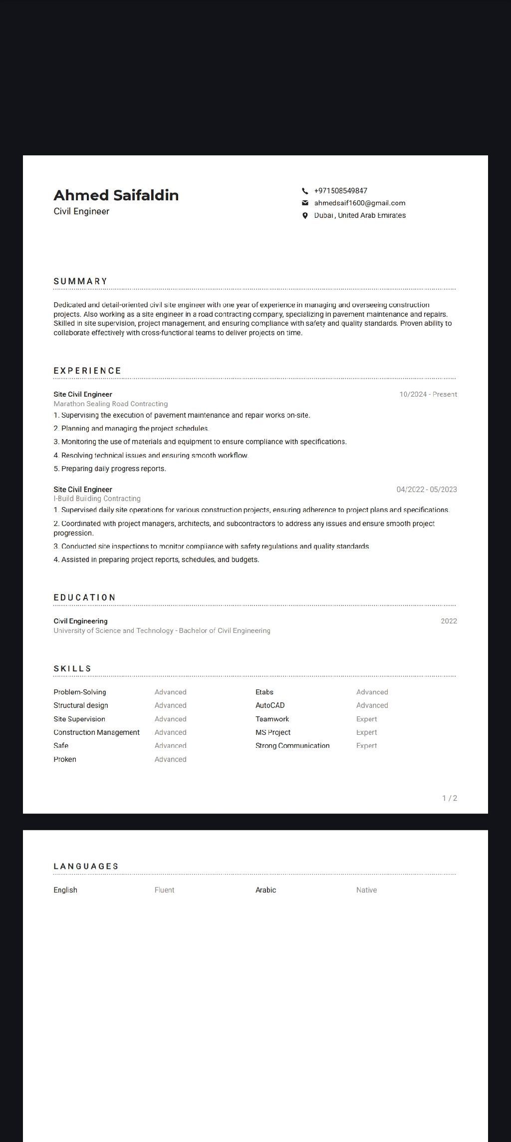 مهندس مدني حاصل على بكالوريوس هندسة مدنيه ورخصة قيادة اماراتية، ابحث عن فرصة عمل مناسبة في مجال المباني. أتميز بالجديه والرغبة في التعلم واكتساب الخبرة العملية داخل الدولة ويمكنني اجتياز امتحان البلدية، ولدي خبرة في مجال الطرق داخل الدولة لمدة سنة