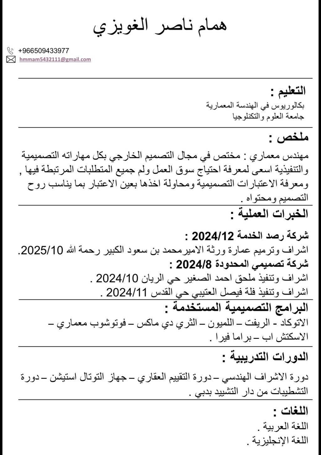 مهندس معماري حاصل على درجة البكالوريوس في الهندسة المعمارية وحاصل على شهادة التشطيبات من دار التشييد في دبي