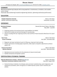 Fresh Mechanical Engineer based in Sharjah, with strong skills in AutoCAD, SolidWorks, and Microsoft Office applications. Actively seeking a suitable entry - level mechanical engineering position, with a high willingness to learn, grow, and contribute effectively to the team