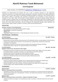 مهندس مدني ومتواجد حاليا في دبي وعندى خبرة 3 سنوات - اشتغلت سنتين في التشطيبات وخلالهم سلمت أكثر من 20 فيلا وشقة تشطيب نهائي بالفرش واشتغلت سنة مع القوات المسلحه في البنيه التحتية في مشروعات حياة كريمة في فترة الجيش واشتغلت في الفترة بين الانتهاء من الجامعة والانضمام الى الجيش في مكتب بناء للاستشارات الهندسية حيث كنت مهندس استشاري للخرسانات ومعمل تكسير المكعبات واستلام الخرسانات وتجهيز الصب