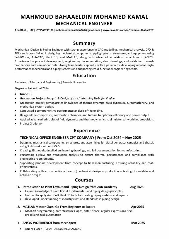 Mechanical Engineer with hands - on experience as a Technical Office Engineer in a Diesel Generator company, skilled in 3D/ 2D design using SolidWorks, AutoCAD, and Plant 3D, engineering analysis using ANSYS Mechanical, ventilation and airflow simulation using ANSYS Fluent, and performing engineering calculations on MATLAB. Experienced in preparing Bill of Materials (BOM) and technical documentation