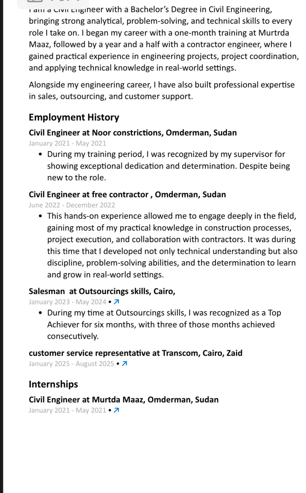 Civil engineer حديث التخرج من السودان أتحدث عربي وانجليزي ابحث عن فرصه لمهندس موقع