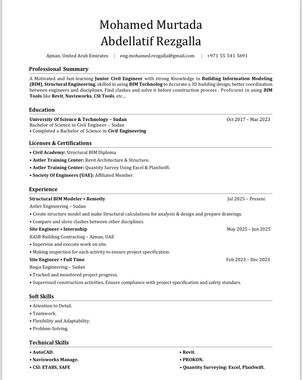 مهندس مدني حديث خريج سنة 2023 متواجد داخل الامارات أحمل رخصة قيادة وبطاقة جمعية المهندسين (SOE) لدي المعرفة في تنفيذ المواقع وأجيد العمل بنظام BIM والتحليل والتصميم الانشائي واستخدام البرامج الهندسية. ابحث عن فرصة عمل مناسبة وجاهز فورا