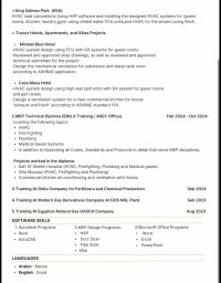 أنا مهندس ميكانيكا قوي خريج كلية الهندسة جامعة المنصورة دفعة 2025، اخدت دبلومة في مجال أل MEP تشمل HVAC, Firefighting, Plumbing. أجيد برامج التصميم أل AutoCAD وأل Revit وبرامج أل HAP, Duct Size, Pipe Sizer, Elite. اشتغلت في مصر في مكتب استشاري هندسي كا HVAC Design Engineer مدة 5 شهور، حاليا متواجد في الامارات بتأشيرة زيارة، متاح للعملكا مهندس موقع أو مكتب فني