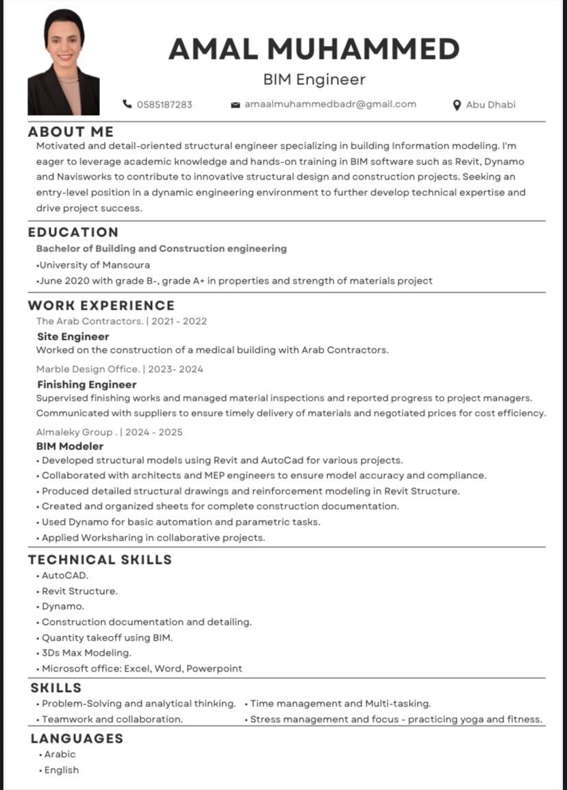 مهندسة مدنيه أعرف اشتغل اوتوكاد وريفيت انشائي كويس وعندي معرفة بنظام أل BIM ممكن اشتغل مكتب فني أو BIM Modeler