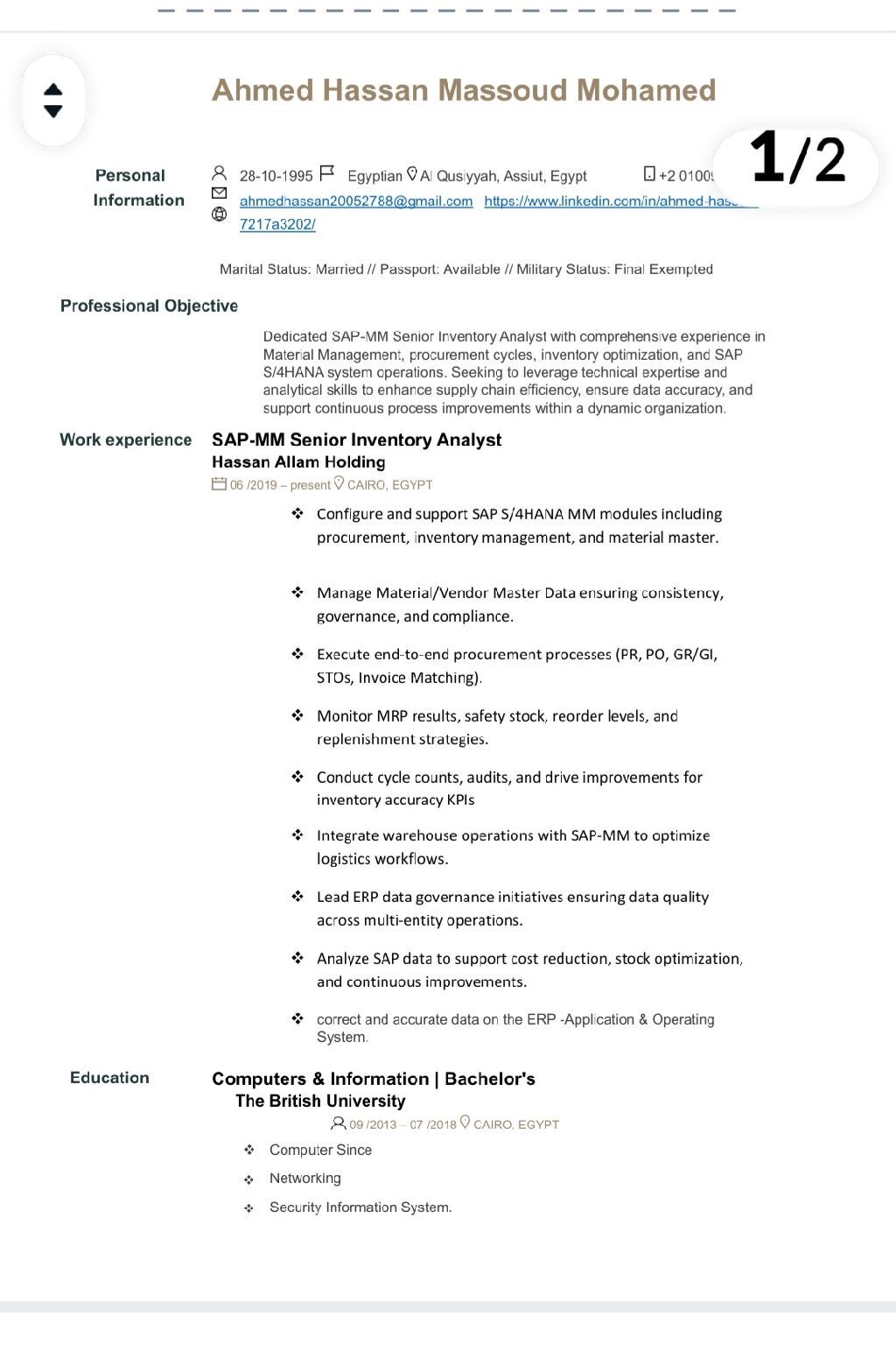 Hello Hiring Manager's I hope you're doing well. I am writing to apply for the SAP - MM Senior Inventory Analyst position you recently posted. I ve attached my CV for your review. I believe my skills and background make me a good fit for this role, and I d love the opportunity to be part of your team. Looking forward to hearing from you. Best regards, Ahmed Hassan Massoud Mohamed + 2 010098079