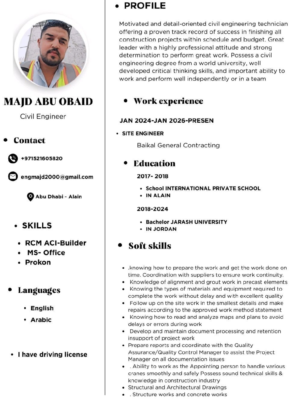 مهندس مدني خبرة سنتين في العين. مهندس موقع. يوجد رخصة قيادة