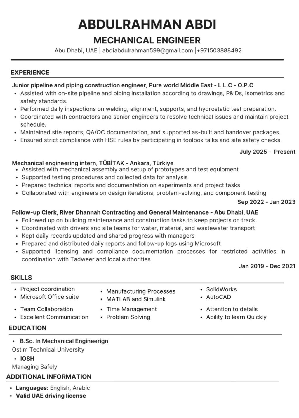 I am a Mechanical Engineer currently working as a Junior Pipeline and Piping Construction Engineer in Abu Dhabi, with hands - on on - site experience in pipeline and piping installation works. Please check out my CV for further information