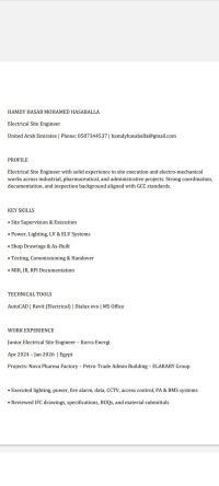 Electrical engineer based in the UAE. I work with AutoCAD, Revit, Duilx Evo, and Microsoft Office. I have two years of experience in Egypt and am fluent in Eng & Arabic