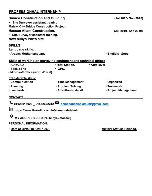 General Surveyor (Site - Technical Office) and Site Supervisor with more than four years of experience. Holder of a Bachelor of Arts in Geography, Surveying and Mapping Division, 2021. Looking for a job opportunity abroad. Located in Egypt